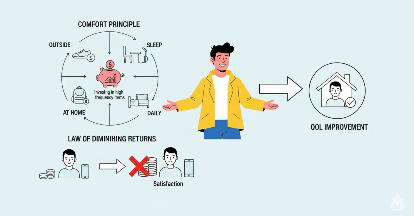 コンフォート原則とは、「毎日長時間使う物にお金を多く使ったほうが幸福度が高い」 という考え方になります。